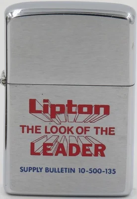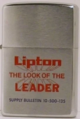 1977 Zippo for Lipton, "The Look for the Leader Supply Bulletin 10-500-135". Thomas Lipton incorporated the Lipton Tea Company in 1915.