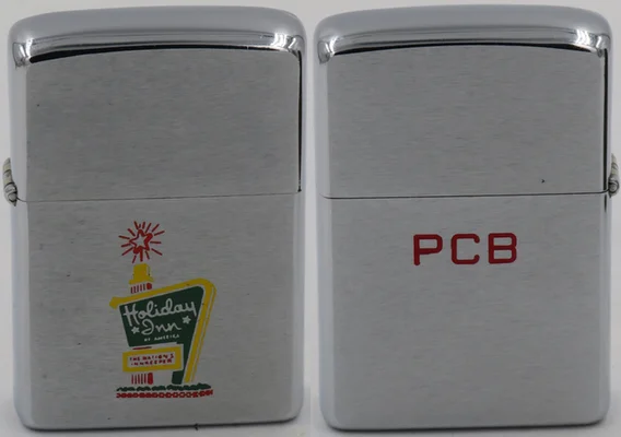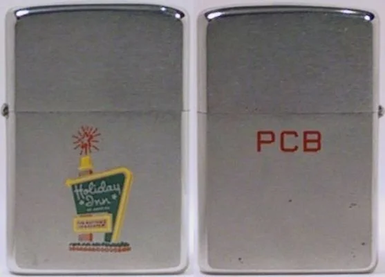 1970 Zippo advertising Holiday Inn. Since Kemmons Wilson built the first Holiday Inn outside Memphis, Tennessee in 1952, the chain, along with its Holiday Inn Express hotels, has expanded to over 3,300 hotels worldwide. The letters PCB are for Philo C Blaisdell, the father of George Blasidell, Zippo Mfg. Co.'s founder