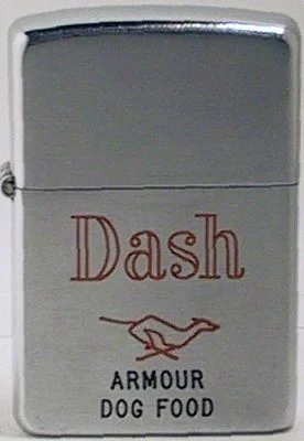 1949-50 Zippo with a dashing grayhound for Dash Armour Dog Food. Armour & Company was a meatpacking company founded in Chicago, in 1867, by the Armour brothers