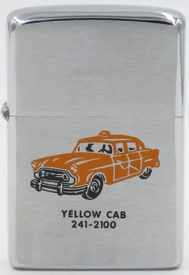 1974 Zippo advertising Yellow Cab taxi service, one of the most well known brands worldwide. Yellow cabs were known in Paris and London throughout most of the 1800s.