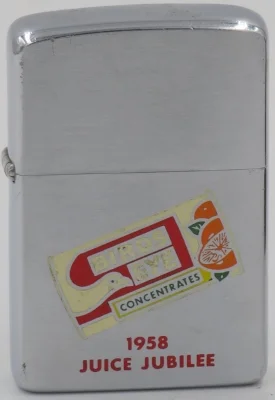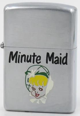1952-53 Zippo advertising Minute Maid, the first company to market orange juice concentrate. Known for its lemonade and orange juice, the company is owned by The Coca-Cola Company.