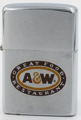 1979 Zippo advertising A&W a chain of fast-food restaurants distinguished by its draft root beer and root beer floats. A&W's origins date back to when Roy W. Allen opened a walk-up root beer stand in Lodi, California, in 1919