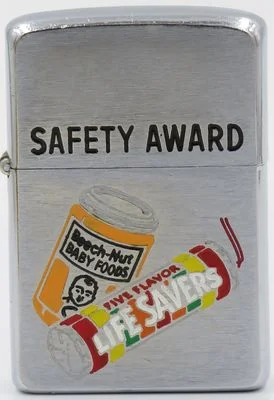 1957 Zippo with graphics of a jar of Beech-Nut baby food and a roll of Five Flavor Life Savers