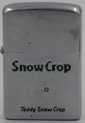 1958 Zippo with Snow Crop's friendly polar bear Teddy. Snow Crop is an orange juice and lemonade brand owned by the Coca-Cola Company