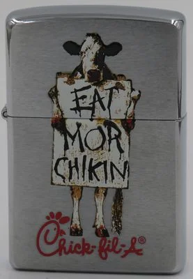 1999 Zippo for Chic-Fil-A with a sad looking cow with a sign "Eat Mor Chikin"