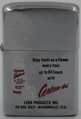 1963 Zippo advertising Certain-dri, "Stay fresh as a flower every hour up to 84 hours..." fopr Leon Products of Jacksonville, FL. .JPG Certain-dri is a leading brand that doctors recommend for their patients with excessive sweating