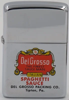 1963 T&C Zippo advertising aDelGrosso Spagetti Sauce, "The Finest Sauce Made". Marianna Pulcino immigrated to America in 1911, bringing with her an old-world recipe for pasta sauce. She established Mom’s Cafe on Walton Avenue in Altoona, Pennsylvania where she served up her classic dishes to the delight of hungry patrons.
