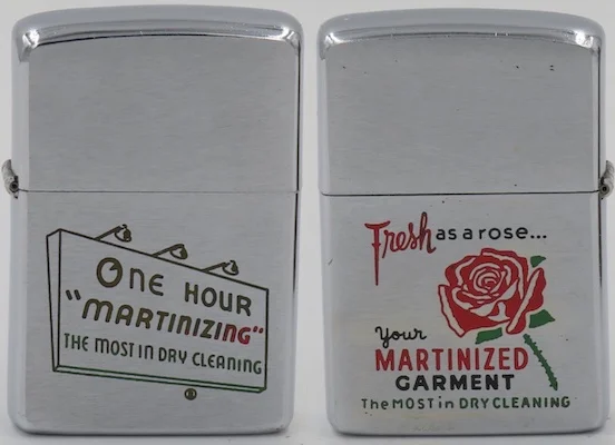 1968 Zippo for One Hour "Martinizing" with a graphic of a rose and the slogan "Fresh as a Flower in Just One Hour" Rose . Martinizing Dry Cleaning is a dry cleaning franchise founded in 1949. Based on Loveland Ohio it is the largest dry cleaning franchise in the United States