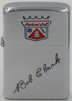 1953 Zippo with Packard Bell logo with Bob Clark's signature engraved. Packard Bell is a Dutch-based computer manufacturing subsidiary of Acer. The brand name originally belonged to an American radio set manufacturer, Packard Bell, founded by Herbert "Herb" A. Bell and Leon S. Packard in 1933