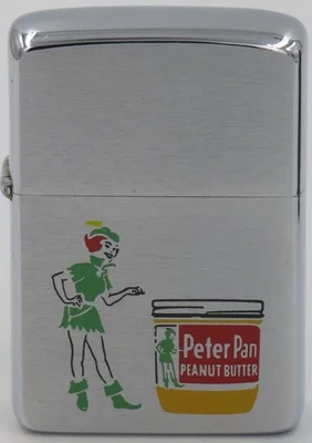 1963 Zippo for Peter Pan Peanut Butter with a graphic of Peter Pan. Peter Pan is a fictional character created by Scottish novelist and playwright J. M. Barrie. A free-spirited and mischievous young boy who can fly and never grows up
