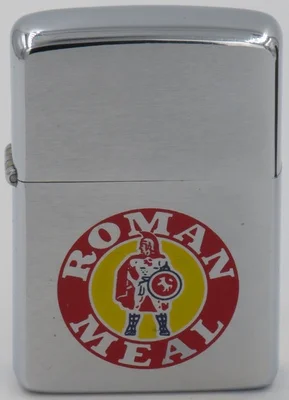 1968 Zippo for Roman Meal Bread.The Roman Meal Company was founded in 1912 on the desire of Canadian physician Robert Jackson to emulate what he believed to be the healthy regimen of Roman soldiers, who purportedly consumed two pounds of wheat or rye a day as part of their rations