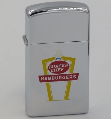 1968 slim Zippo for Burger Chef Hamburgers. Burger Chef was an American fast-food restaurant chain. It began operating in 1954 in Indianapolis, Indiana, expanded throughout the United States, and, at its peak in 1973, had 1,050 locations. Is ceased operations in 1996.