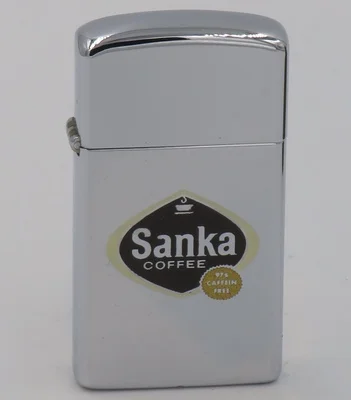 1965 slim Zippo for Sanka Coffee. Sanka is a brand of instant decaffeinated coffee, sold around the world, and was one of the earliest decaffeinated varieties. Sanka is distributed in the United States by Kraft Foods