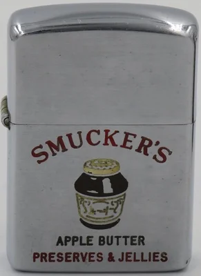 1954 Zippo advertising Smucker's apple butter, preserves & jellies. The company bears the name of Jerome Monroe Smucker who first pressed cider at a mill he opened in 1897 and who later produced apple butter which he sold from the back of a horse-drawn wagon.