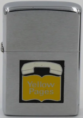 1974 Zippo for Yellow Pages telephone directories. The name and concept of "yellow pages" came about in 1883, when a printer in Cheyenne, Wyoming, working on a regular telephone directory ran out of white paper and used yellow paper instead. In 1886, Reuben H. Donnelley created the first official Yellow Pages directory