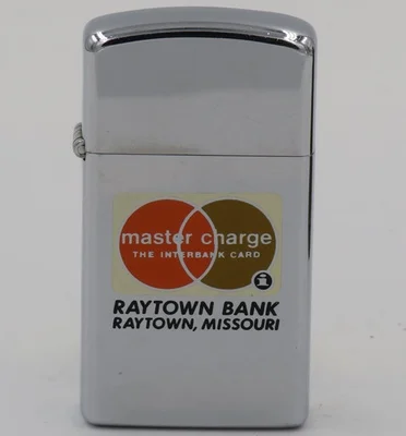 1977 slim Zippo Master Charge The Interbank Card Raytown Bank, Ratown, Missouri. The Interbank Card Association, known as Master Charge, was founded in 1966 for the purpose of sharing the cost of bank credit card processing across many banks