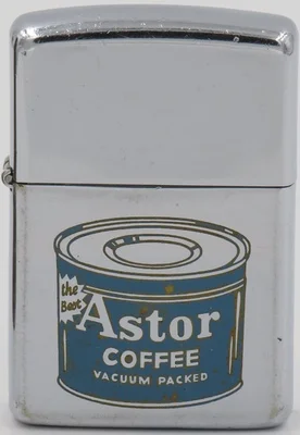 1961 Zippo for Astor Coffee, one of the first coffee brands that adopted vacuum packed technology to preserve coffee's freshness. The brand is no longer in existence.
