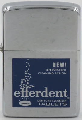 1967 Zippo advertising Efferdent Denture Cleanser Tablets. Efferdent is a product of Pfizer, Inc., a leading producer of pharmaceuticals and other health related products