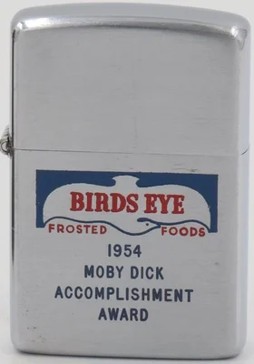 1953 Zippo for Birds Eye Frosted Foods - 1954 Moby Dick Accomplishment Award. The company is named after Clarence Birdseye, the inventor of frozen food.