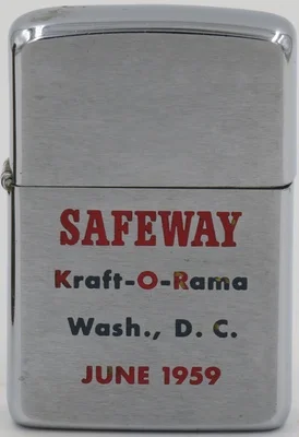 1959 Zippo for Safeway, a major supermarket chain founded in 1915. "Kraft-O-Rama" involved the promotion of Kraft Food products within its stores