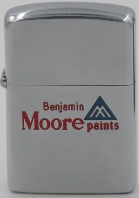 1954-55 Zippo for Benjamin Moore paints, a company that produces paint. It is owned by Berkshire Hathaway. Founded in 1883, Benjamin Moore is based in Montvale, New Jersey