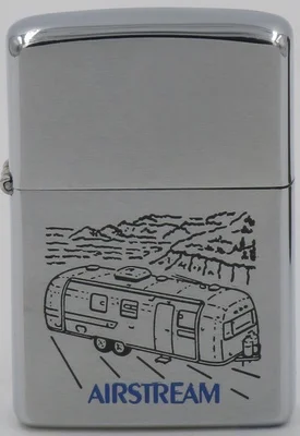 1977 Zippo for Airstream, Founded in 1931, Airstream is a brand of luxury trailers which are easily recognized by the distinctive shape of their rounded polished aluminum coachwork as depicted in the graphic