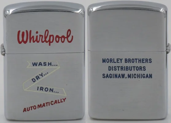 1953 Zippo advertising Whirlpool automatic washing machines which "Wash Dry Iron Automatically" distributed by Morley Brothers in Saginaw Michigan