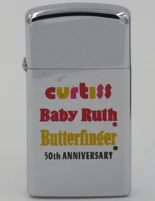 1973 slim Zippo commemorating the 50th Anniversary of the Curtiss Candy Company. The "Baby Ruth" candy bar not named after Babe Ruth, the home run king, but supposedly after President Cleveland’s daughter "baby" Ruth. The "Butterfinger" candy bar was introduced in 1928