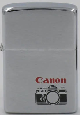 1981 Zippo with a Canon camera. The origins of Canon date back to the founding of Precision Optical Instruments Laboratory in Japan in 1937. Between 1933 and 1936 'The Kwanon', a copy of the Leica design, Japan's first 35 mm focal-plane-shutter camera, was developed in prototype form
