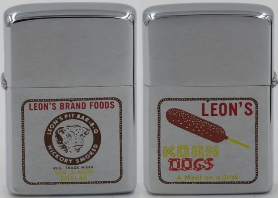 1961 two-sided Zippo. The front advertises Dallas-based Leon's Pit Bar-B-Q, and the reverse advertises Leon's "Korn" Dogs. Leon’s pit bar-b-que was created in 1946, and 1954 was the year Leon’s built the first U.S.D.A. inspected bar-b-que facility in the United States. This facility was expanded in 1960 when Leon’s began producing corn dogs for the foodservice trade. Today the business is known as Leon's Texas Cuisine