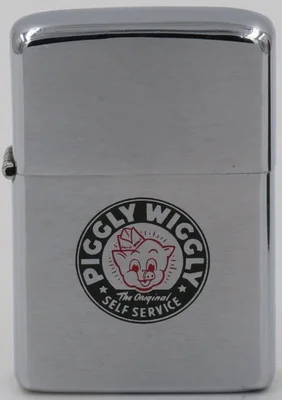 1974 Zippo Piggly Wiggly. Piggly Wiggly is a supermarket chain operating in the Southern and Midwestern regions of the United States. Its first outlet opened in 1916 in Memphis, Tennessee, and is notable for having been the first true self-service grocery store, and the originator of various familiar supermarket features such as checkout stands, individual item price marking and shopping carts