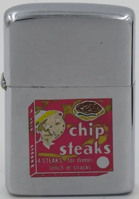 1959 Zippo advertising Chip Steaks. The chip steak was invented in 1936 and was popular throughout the years following because of its value and its ease of cooking. Though chip steaks have decreased in popularity, this frozen, thin sliced patty is still widely available for purchase online and at butcher shops