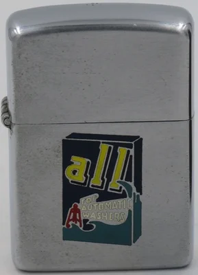 1960 Zippo with a colorful box of the detergent "All - For Automatic Washers". All is a product of Unilever, one of the world's leading producers of household products