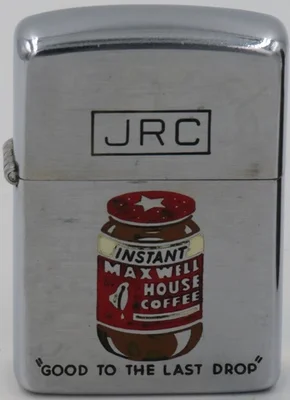 1954 Canadian Zippo advertising Maxwell House Instant Coffee engraved with the initials "JRC" and with the slogan "Good to the Last Drop". In 1892, Joel Cheek presented his own blend of coffee to the management of the Maxwell House Hotel in Nashville, Tennessee. Soon the coffee became known as Maxwell House™ coffee. Years later President Theodore Roosevelt visited the hotel and declared the coffee 'good to the last drop
