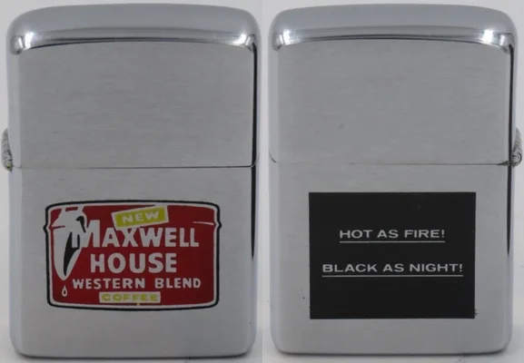 1960 two-sided Zippo advertising Maxwell House Western Blend, "Hot as Fire! Black as Night!"