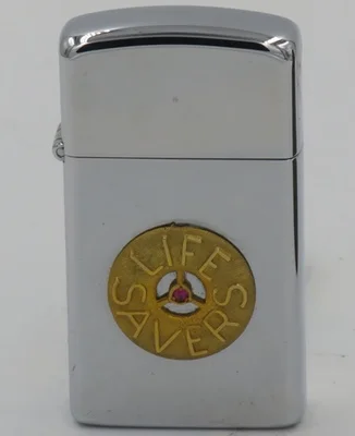 1977 slim Zippo with an attached badge for Life Savers. First marketed in 1912, Life Savers is a traditional American brand of hard candy. The multi-flavored ring shaped candies are packaged in rolls