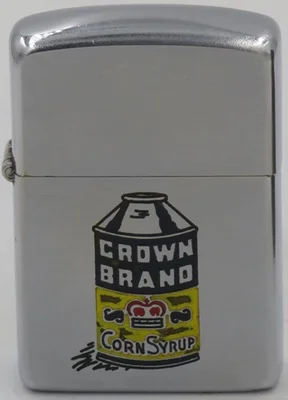 1950's Canadian Zippo advertising Crown Brand Corn Syrup. Crown Golden Corn Syrup has been a staple in the Canadian kitchen cupboards since 1900. Crown is the preferred brand in Quebec, Atlantic Canada and British Columbia