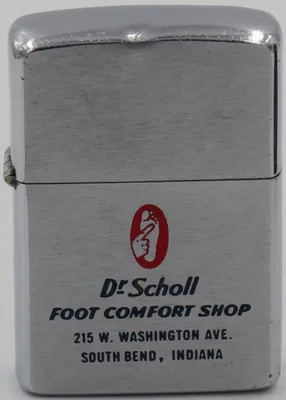 1959 Zippo for Dr. Scholl Foot Comfort Shop in South Bend, Indiana. Dr. Scholl's is a footwear and foot care brand started by podiatrist William Mathias Scholl in Chicago in 1906