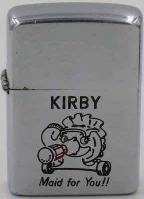 1952-53 Zippo with a cute Kirby vacuum cleaner graphic "Maid for You!!". The Kirby vacuum is named after James Kirby, aninventor who built his first vacuum cleaner in 1906.