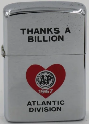 1967 Zippo for A&P' Atlantic Division with a heart and "Thanks a Billion". The Great Atlantic & Pacific Tea Company has a 150 year-old history and was America's leading grocery store chain in the 1960's