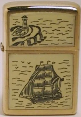 1986 Zippo with a graphic of a sailing ship near a lighthouse. What is unusual is that the bottom is flat rather than canned as is standard for Zippo lighters