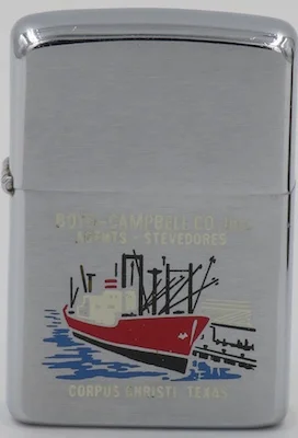 1973 Zippo with an image of a docked cargo ship for Boyd-Campbell Co. Inc. - Agents-Stevedores - Corpus Christi, Texas