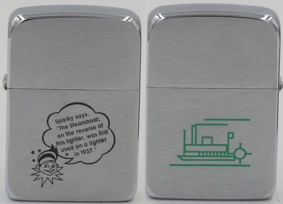 2002 Zippo replica of the paddle boat Zippo shown above. "Sparky says: The Steamboat on the reverse of this light was first used on a lighter in 1937