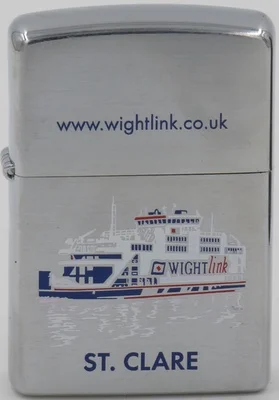 2007 Zippo with a graphic of MV St. Clare, a ferry operated by Wightlink connecting Portsmouth on the English mainland to Fishbourne on the Isle of Wight. The ferry was built in Gdańsk in 2001
