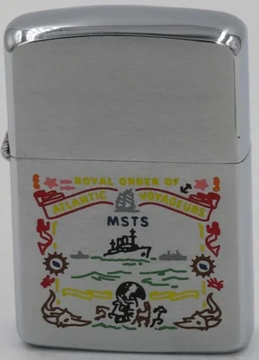 1960 Zippo with a colorful engraving of Royal Order of Atlantic Voyagers - MSTS (Military Sea Transportation Service). The Royal Order of Atlantic Voyagers was a certificate issued to any voyager who crossed the equator in a ritualistic initiation ceremony held on board ship. The certificates were signed by "Davy Jones, His Majesty's Scribe" and "Neptunus Rex, Ruler of the Raging Main"