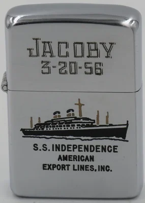 This 1955 Zippo has an engraving of the SS Independence of American Export Lines for "Jacoby 3-20-55". It is one of the oldest and most storied ocean liners still afloat.