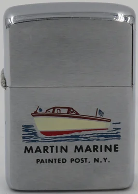 1960 Zippo for Martin Marine in Painted Post NY. with a graphic of what looks like a Chris Craft wooden boat