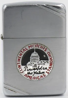 1940-41 Zippo with a metallique logo of Continental Motors with the slogan "Powerful as the Nation". Continental Motors Company was a manufacturer of internal combustion engines founded in 1905